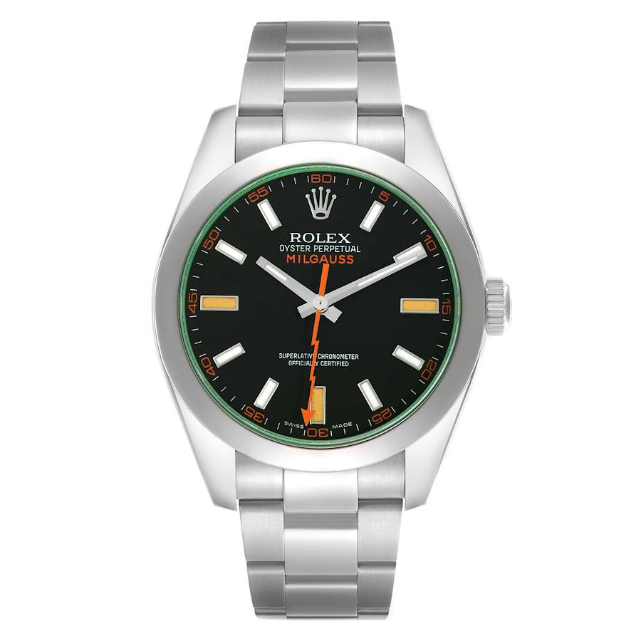 Replica Rolex Milgauss 40 Green Crystal Black Dial Steel Mens Watch 116400. Officially certified chronometer automatic self-winding movement. Stainless steel oyster case 40.0 mm in diameter. Rolex logo on the crown. Stainless steel smooth domed bezel. Scratch resistant green sapphire crystal. Black dial with luminescent baton hands and hour markers. Orange lightning-bolt seconds hand. Outer minute and 1/2 second stick markers. Stainless steel oyster bracelet with an Oysterlock clasp. Fits an 7 3/4" wrist.