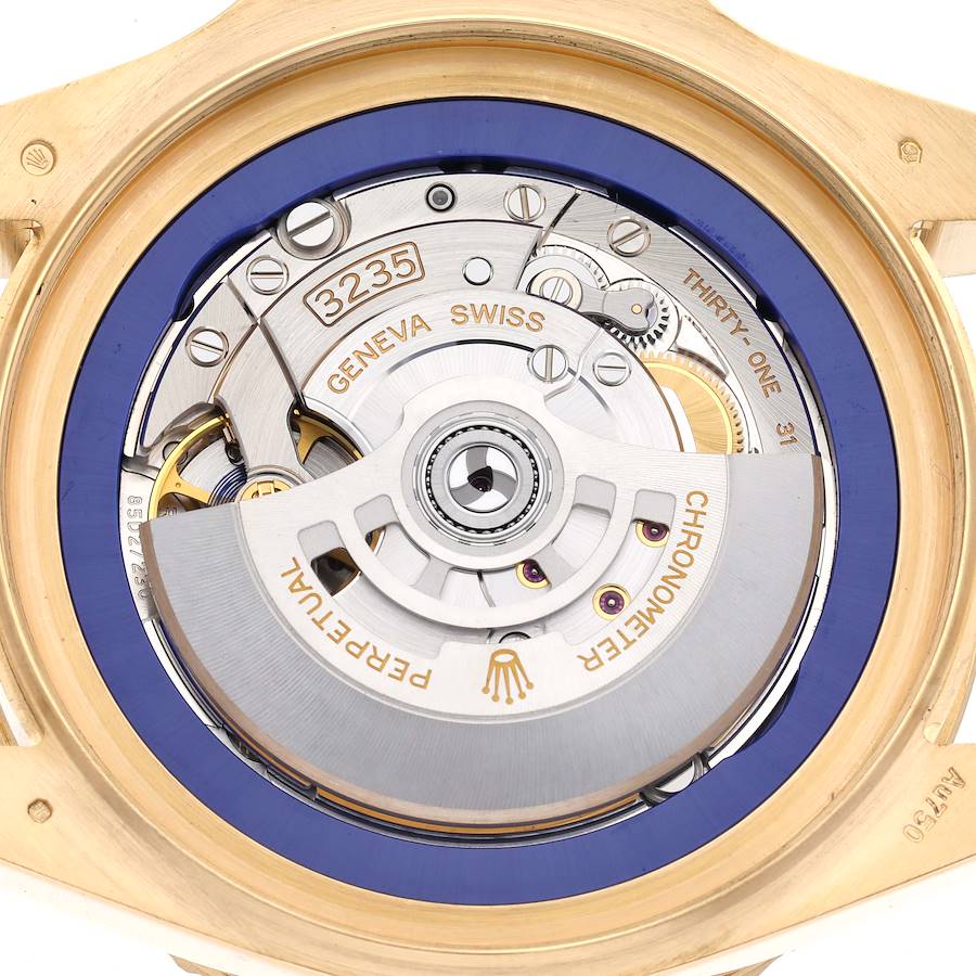 Bezel: 18k yellow gold special time-lapse unidirectional rotating Cerachrom ceramic blue bezel with 60-minute graduation coated in gold.
