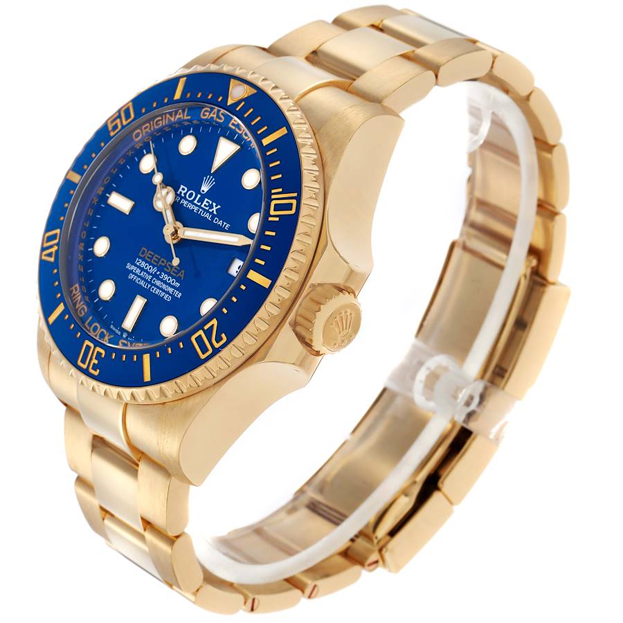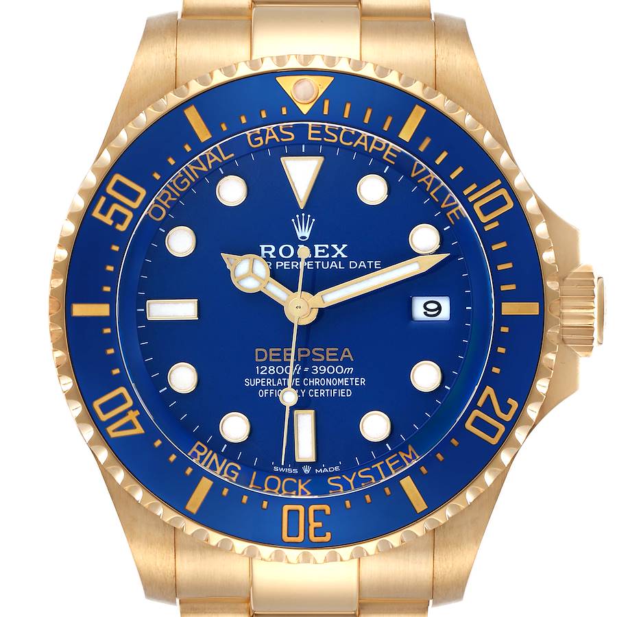 Replica Rolex Seadweller Deepsea Blue Yellow Gold Mens Watch 136668. Officially certified chronometer automatic self-winding movement. High-performance Paraflex shock absorbers. Bidirectional self-winding via Perpetual rotor. 18k yellow gold oyster case 44.0 mm in diameter. Rolex logo on the crown. Pointed crown guard. 18k yellow gold special time-lapse unidirectional rotating Cerachrom ceramic blue bezel with 60-minute graduation coated in gold. Domed scratch resistant sapphire crystal. Blue dial with luminescent yellow gold Mercedes hands and dot hour markers. Luminescent yellow gold lollipop-tipped center seconds hand. Minute markers around the outer rim. Date calendar at the 3 o'clock aperture. 18k yellow gold oyster bracelet with a flip-lock clasp. Fits an 8.5" wrist.
