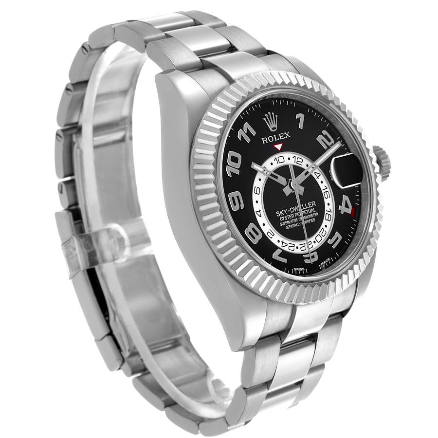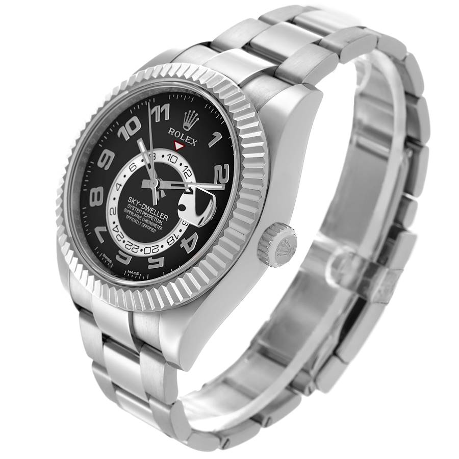 Replica Rolex Sky-Dweller White Gold Black Dial Mens Watch 326939. Officially certified chronometer automatic self-winding movement. 18k white gold case 42.0 mm in diameter. Rolex logo on the screw-down twinlock crown. 18K white gold fluted rotatable 90-degree ring command bezel. Scratch resistant sapphire crystal with cyclops magnifier. Black dial with raised white gold Arabic numeral hour markers and baton hands. 24-hour display on off-centre disc. Second time zone subdial at 6 o'clock. Instantaneous annual calendar at 3 o'clock with rapid-setting of the date. Month display via 12 apertures around the circumference of the dial. 18k white gold bracelet with an oysterlock clasp. Fits a 7.5" wrist.