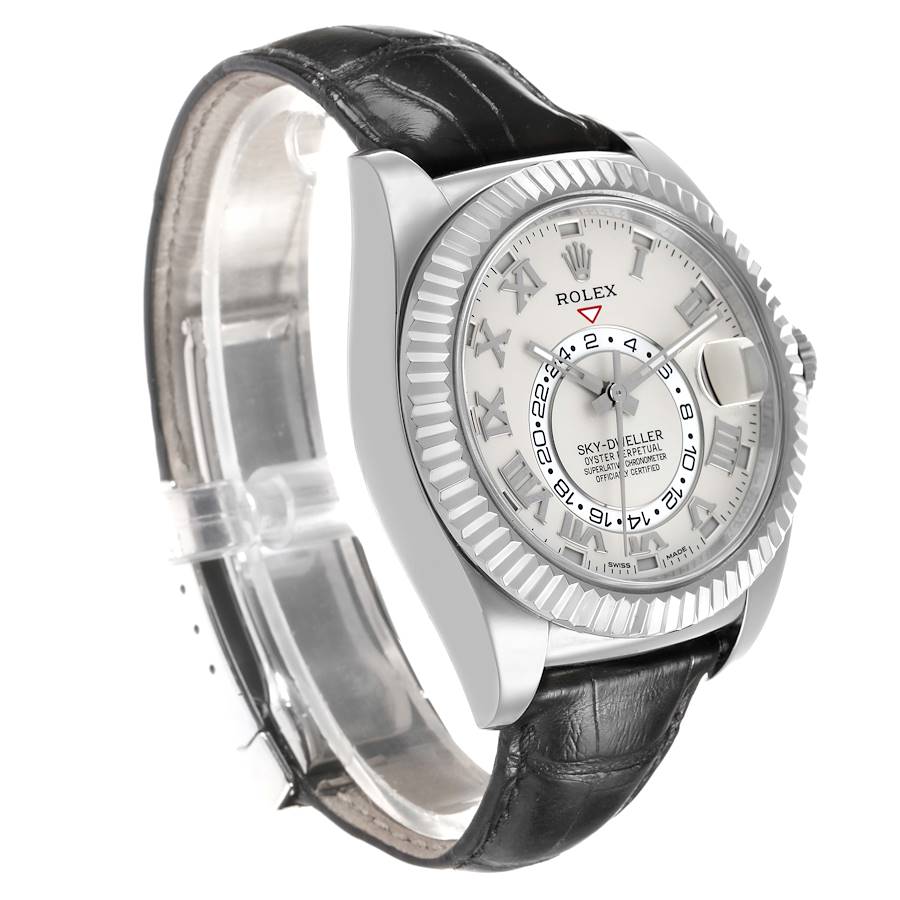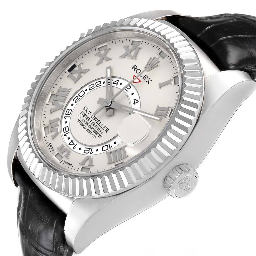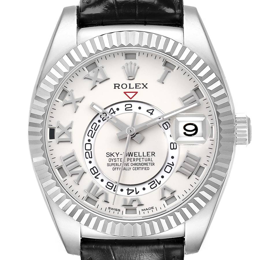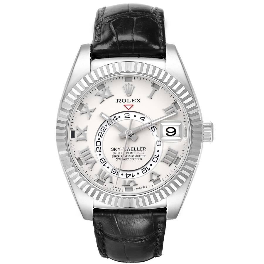 Replica Rolex Sky-Dweller White Gold Ivory Dial Mens Watch 326139. Officially certified chronometer automatic self-winding movement. 18K white gold case 42.0 mm in diameter. Rolex logo on a screw-down twinlock crown. 18K white gold fluted rotatable ring command bezel. Scratch resistant sapphire crystal with cyclops magnifier. Ivory dial with raised white gold arabic numerals. 24-hour display on off-centre disc. Instantaneous annual calendar at 3 o'clock with rapid-setting of the date. Month display via 12 apertures around the circumference of the dial. Black crocodile leather strap with the 18K white gold folding oysterclasp.
