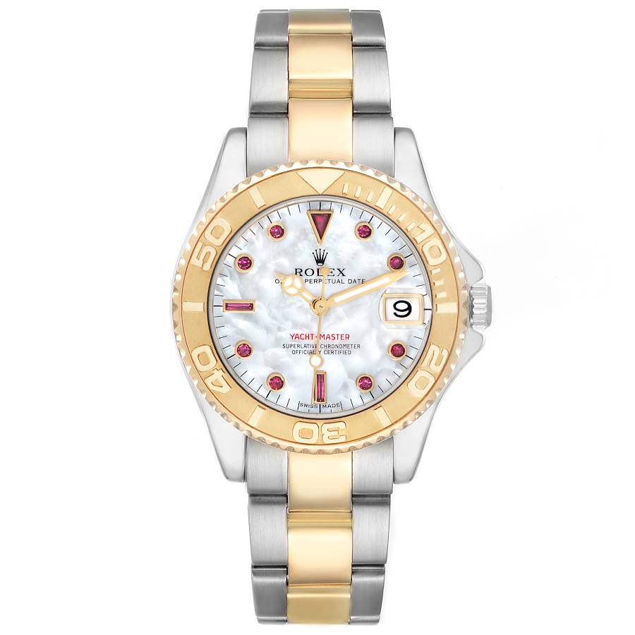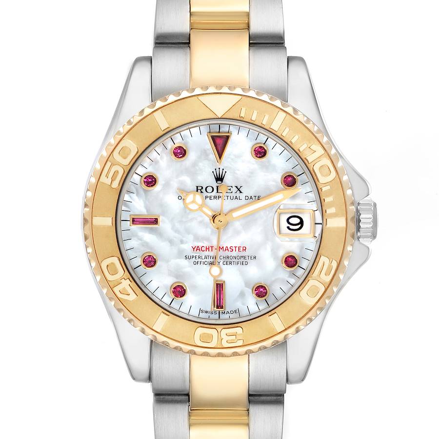Replica Rolex Yachtmaster 35 Midsize Yellow Gold MOP Ruby Dial Watch 168623. Officially certified chronometer self-winding movement. Stainless steel and 18K yellow gold oyster case 35.0 mm in diameter. Rolex logo on the crown. 18K yellow gold special time-lapse unidirectional rotating bezel. Scratch resistant sapphire crystal with a cyclops magnifier. Mother of pearl Serti dial with original Rolex factory ruby hour markers. Gilt Mercedes hands with luminescent inserts and a lollipop-tipped centre seconds hand. Date calendar at the 3 o'clock aperture. Stainless steel and 18K yellow gold oyster bracelet with a flip-lock clasp. Fits a 6.5" wrist.