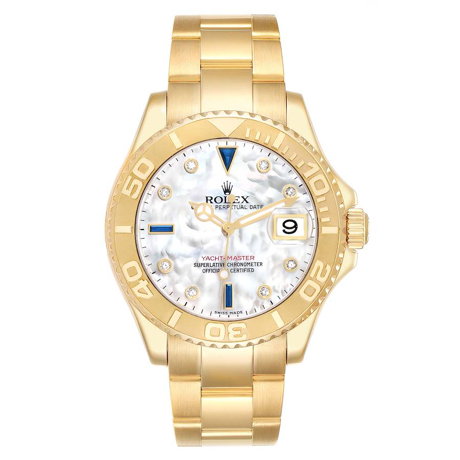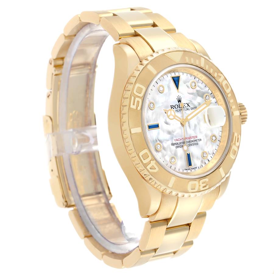 Replica Rolex Yachtmaster 40mm Yellow Gold MOP Diamond Sapphire Mens Watch 16628B. Officially certified chronometer automatic self-winding movement. Rhodium-plated, oeil-de-perdrix decoration, straight-line lever escapement, free sprung monometallic balance adjusted to temperatures and 5 positions, shock absorber, self-compensating Breguet balance spring, Microstella regulating screws, hack mechanism. 18K yellow gold oyster case 40.0 mm in diameter. Screwed-down caseback and crown, Triplock winding-crown protected by the crown guard. Rolex logo on the 18k yellow gold crown. 18k yellow gold special time-lapse bidirectional rotating bezel. Scratch resistant sapphire crystal with a cyclops magnifier. White mother of pearl dial with yellow gold-outlined original Rolex factory diamond and sapphire dot hour markers. Luminescent yellow gold Mercedes hands with a lollipop-tipped center second hand. Date calendar at the 3 o'clock aperture. Outer stick minute markers. 18k yellow gold oyster bracelet with a flip-lock clasp. Fits a 7 1/4" wrist.