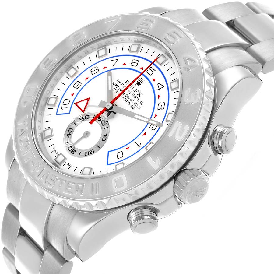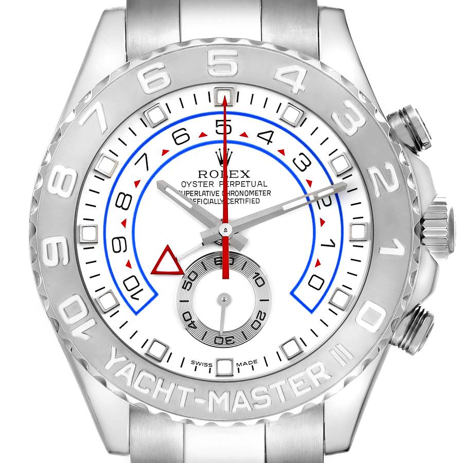 Replica Rolex Yachtmaster II Regatta White Gold Platinum Mens Watch 116689. Officially certified chronometer self-winding movement. 18K white gold oyster case 44.0 mm in diameter. Screw down crown and caseback. Rolex logo on the crown. 90 degree rotating platinum ring command bezel. Scratch resistant sapphire crystal. White dial with luminescent white gold baton hands and hour markers. Minute markers around the outer rim. Small seconds subdial at 6 o'clock. 18K white gold oyster bracelet with a flip-lock clasp. Fits a 7 3/4" wrist.
