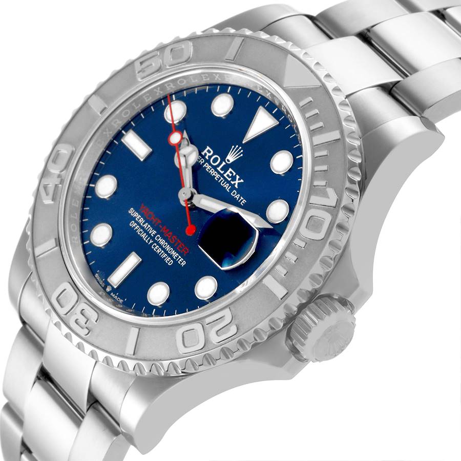 Replica Rolex Yachtmaster Steel Platinum Blue Dial Mens Watch 126622. Officially certified chronometer automatic self-winding movement. Stainless steel oyster case 40.0 mm in diameter. Rolex logo on the crown. Platinum special time-lapse bidirectional rotating bezel. Scratch resistant sapphire crystal with a cyclops magnifier. Blue dial with luminescent dot, baton and triangle hour markers. Luminescent Mercedes hands. Minute markers around the outer rim. Date calendar at the 3 o'clock aperture. Stainless steel oyster bracelet with a flip-lock clasp. Fits a 7 3/4" wrist.