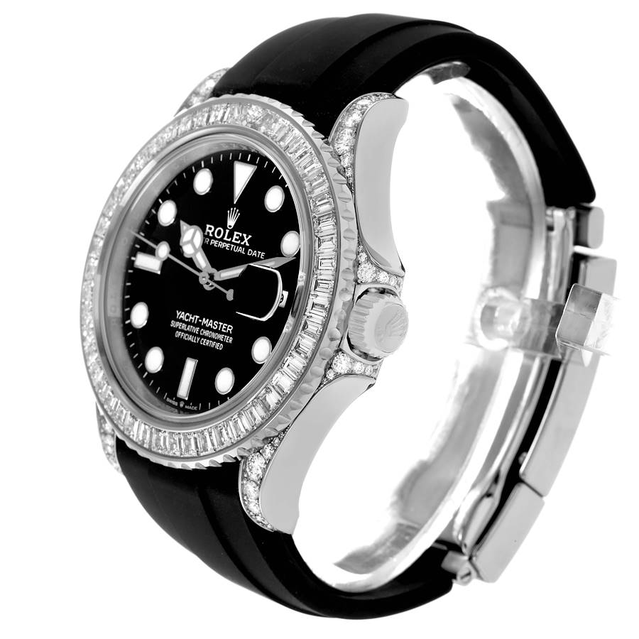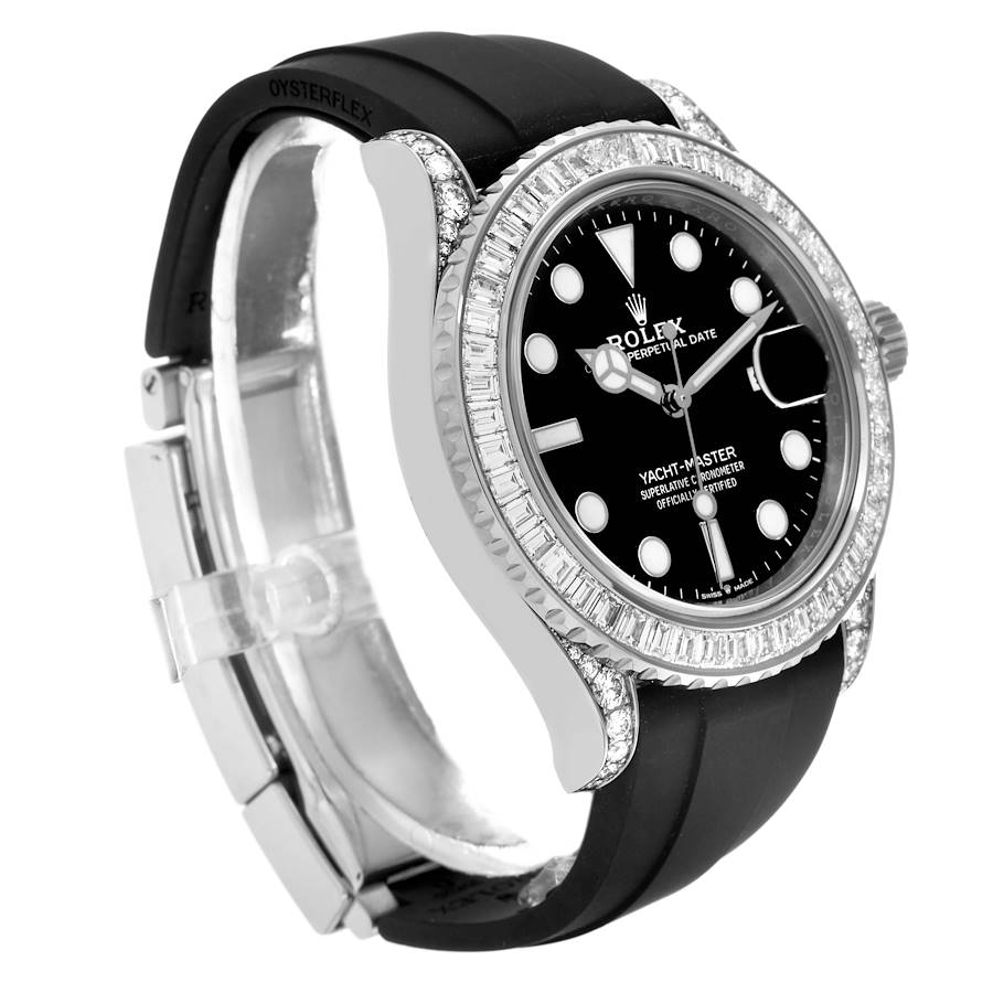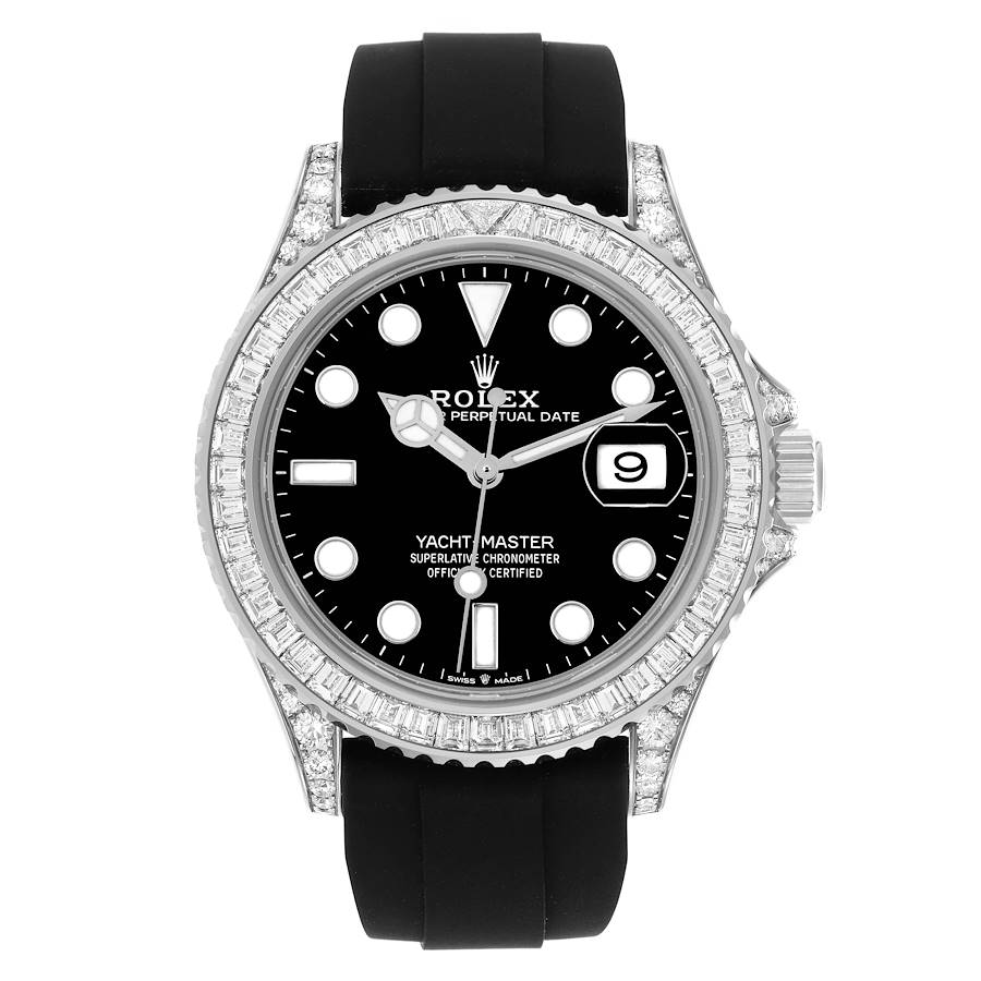 Replica Rolex Yachtmaster White Gold Diamond Oysterflex Mens Watch 226679. Officially certified chronometer automatic self-winding movement. 18K white gold oyster case 42.0 mm in diameter with diamond lugs. Screwed-down caseback and crown, Triplock winding crown protected by diamond crown guards. Rolex logo on the crown. Bidirectional rotating bezel with original factory Rolex diamonds. Scratch resistant sapphire crystal with a cyclops magnifier. Black dial with luminescent dot hour markers. Outer minute divisions, Mercedes hands with luminescent inserts and lollipop-tipped center seconds. Date calendar at the 3 o'clock aperture. Black Oysterflex rubber strap with an 18k white gold flip-lock clasp.